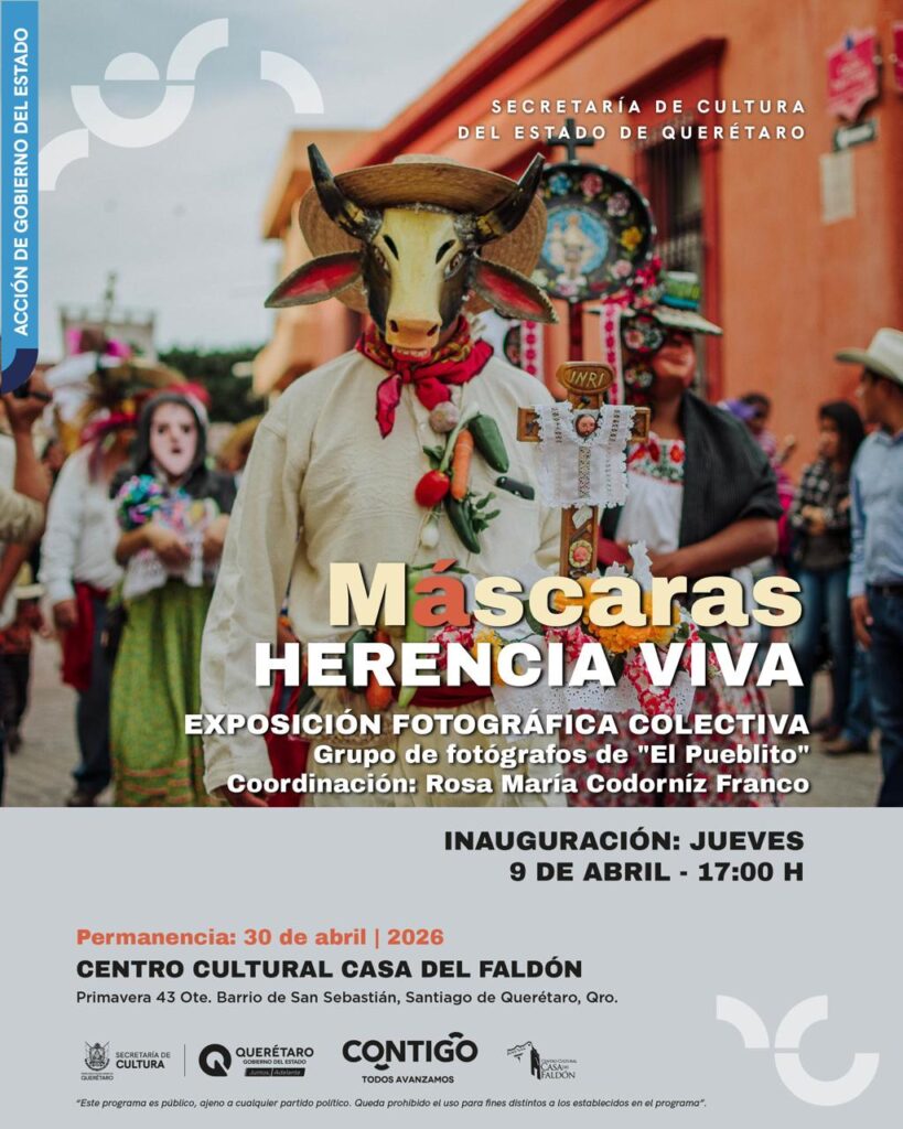 Del 9 al 30 de abril el Centro Cultural Casa del Faldón, de la Secretaría de Cultura del estado, albergará la exposición “Máscaras: Herencia Viva”, una muestra fotográfica que centra su mirada en uno de los símbolos esenciales de las festividades en honor a Nuestra Señora de El Pueblito, en esa comunidad durante el mes de febrero, en el municipio de Corregidora.