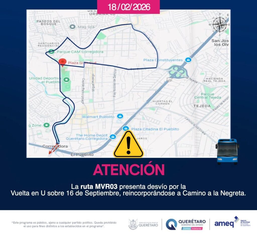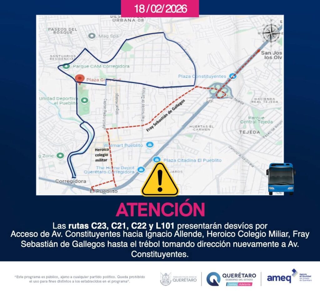 De acuerdo con el aviso emitido por la AMEQ, entre las 6:30 y las 11:00 de la mañana se realizarán modificaciones en las rutas C23, C21, C22, L101, L56, MVR02 y MVR03, debido al paso de los corredores y al operativo vial implementado en el primer cuadro de El Pueblito y vialidades aledañas.