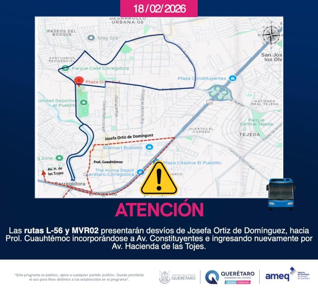 Corregidora, Qro. 18 de Febrero.- Con motivo de la séptima edición de la carrera atlética “Pasos por Querétaro”, programada para este domingo 22 de febrero en la zona de la Pirámide de El Pueblito, AMEQ informa sobre cierres viales y desvíos en diversas rutas de autobús.