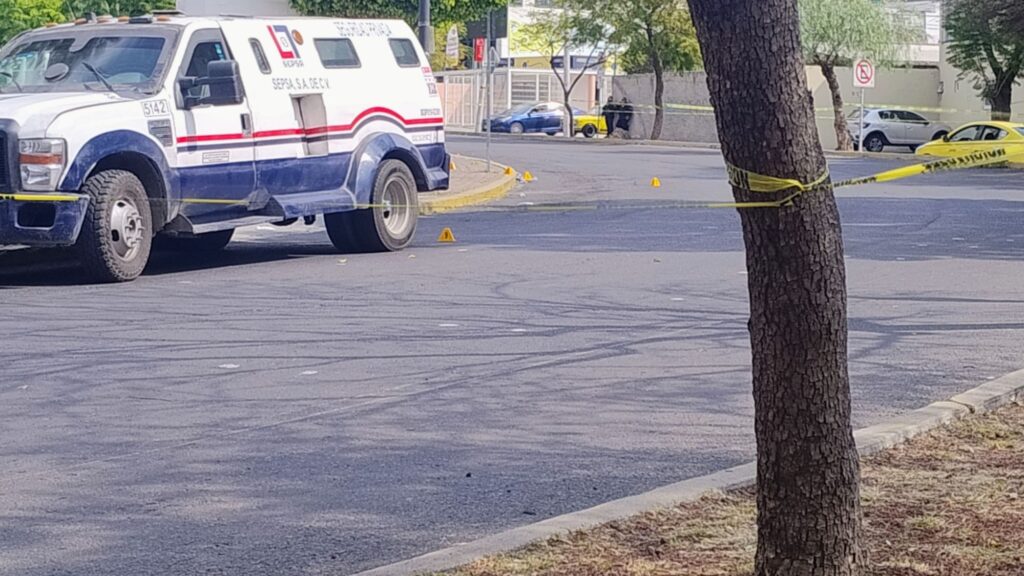 Querétaro, Qro., 22 de diciembre.— Un intento de asalto a elementos de una empresa de traslado de valores se registró la mañana de este lunes al exterior de una sucursal bancaria BBVA ubicada en la colonia Álamos, lo que derivó en un intercambio de disparos, personas lesionadas y la detención de dos presuntos responsables.
