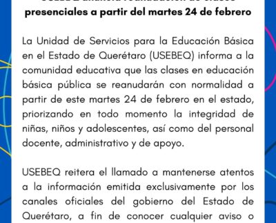 La Unidad de Servicios para la Educación Básica en el Estado de Querétaro (USEBEQ) informó que las clases presenciales en…