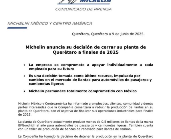 Michelin anuncia su decisión de cerrar su planta de Querétaro a finales de 2025