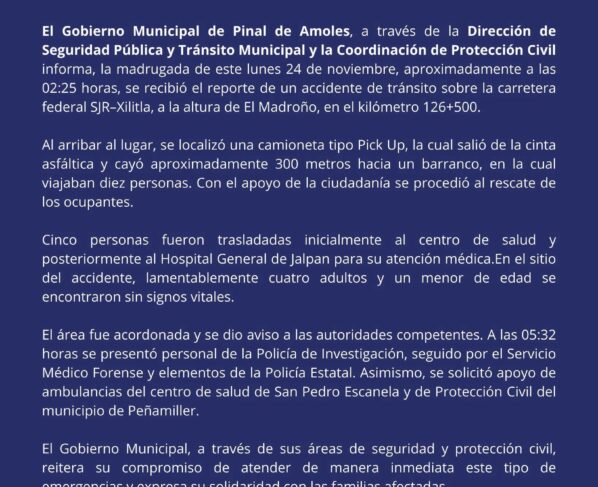 Pinal de Amoles, Qro., 24 de noviembre. La madrugada de este lunes se registró un trágico accidente en la carretera federal San Juan del Río–Xilitla, a la altura de la…