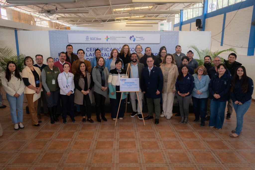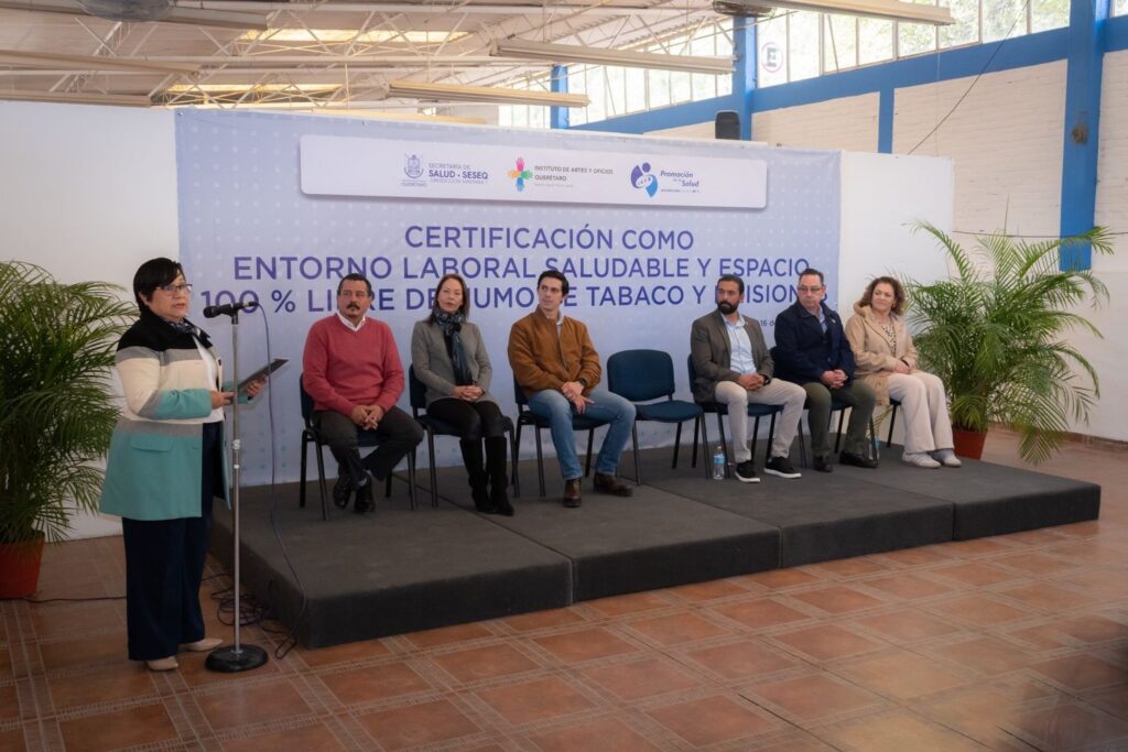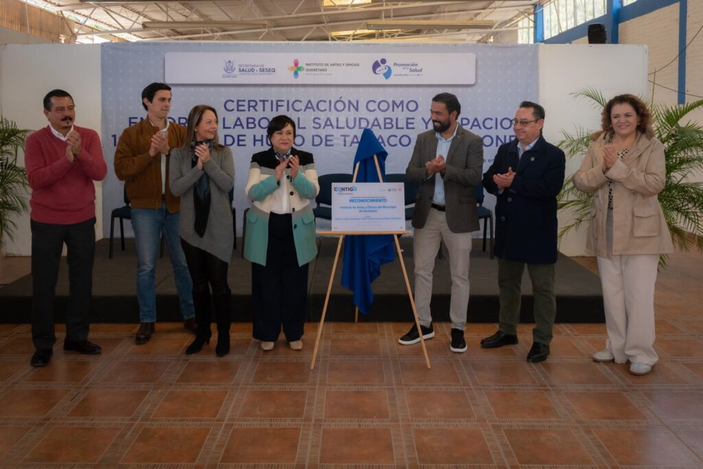 La titular de la Secretaría de Salud (SESA) del estado de Querétaro, Martina Pérez Rendón, encabezó la ceremonia de develación de la placa que acredita la certificación del edificio del Instituto de Artes y Oficios como Entorno Laboral Saludable y 100 por ciento Libre de Humo de Tabaco, reconocimiento que refrenda el compromiso institucional con la protección y promoción de la salud de las y los trabajadores.