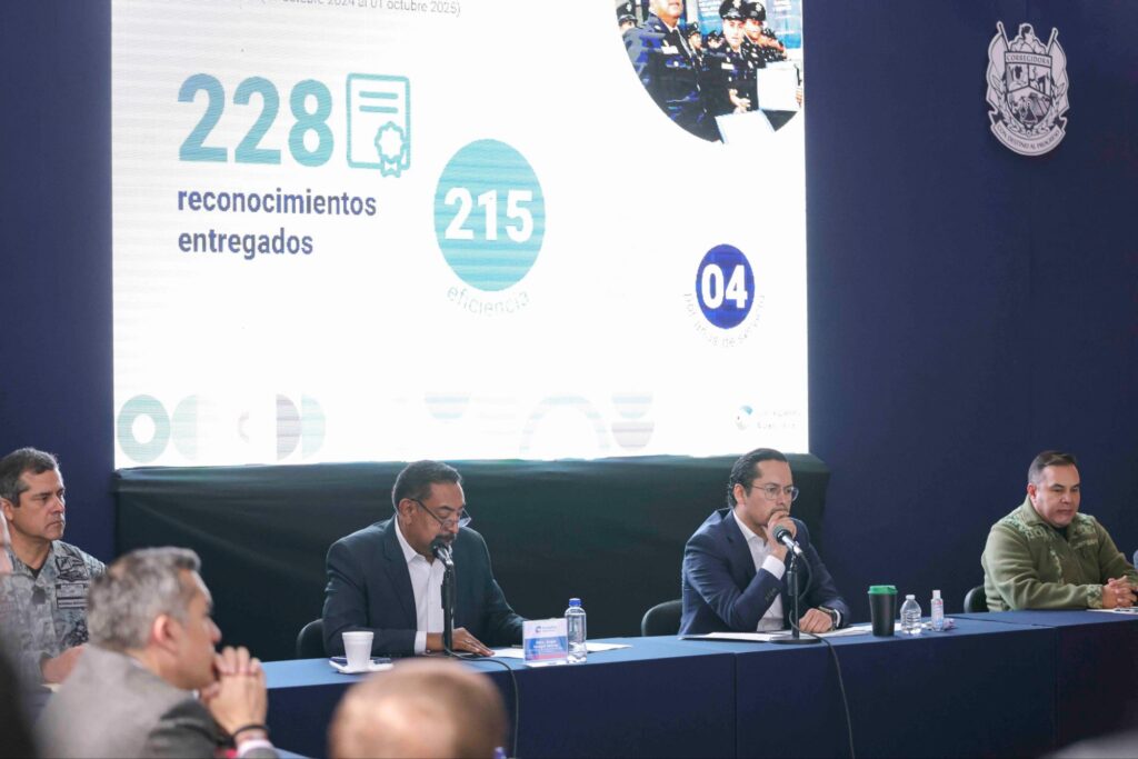 Además, destacó que: el 100% del personal cuenta con Certificado Único Policial (CUP); se recibieron 285 aspirantes a Policía de Proximidad; se entregaron 228 reconocimientos a elementos por eficiencia, mérito y años de servicio; se implementó el programa “Cuidamos a quienes nos cuidan”, que benefició a 50 elementos con apoyo para mejorar sus viviendas; se habilitó la Unidad Cinotáctica y avanza la próxima inauguración del C2 Santa Bárbara.