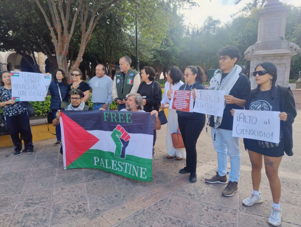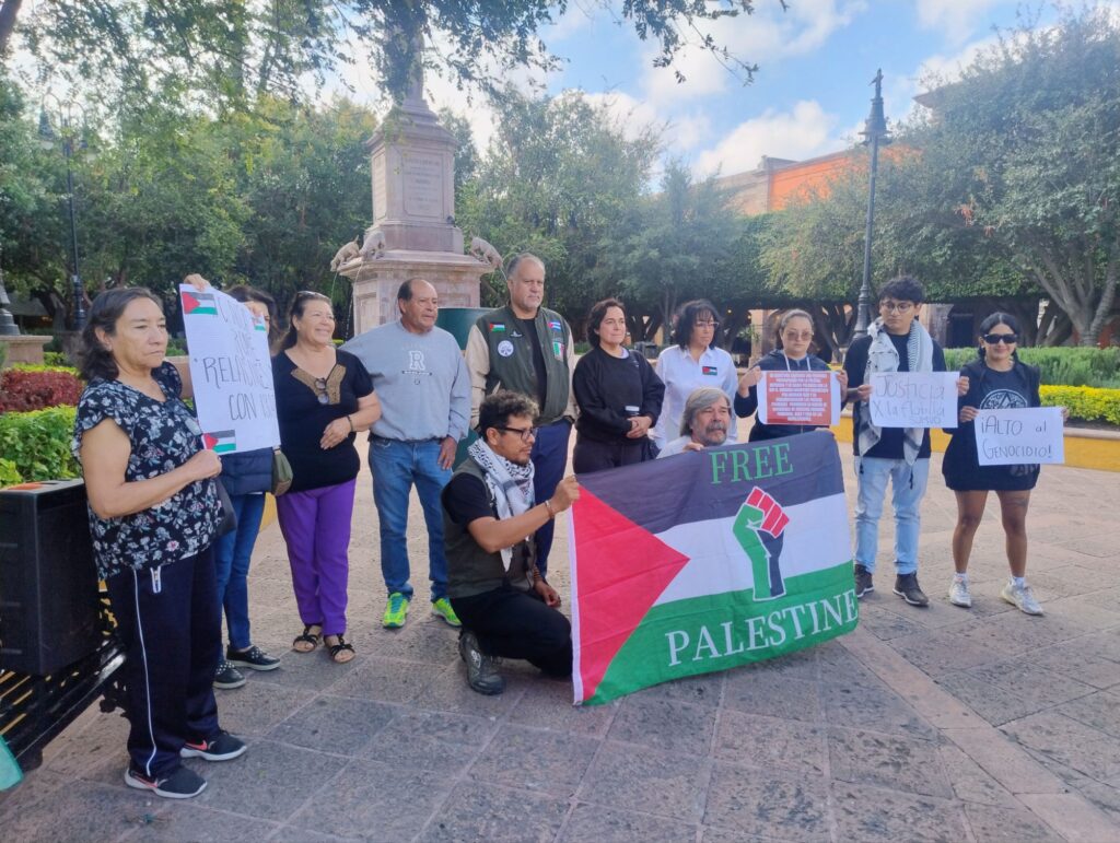 Querétaro, Qro., 2 de octubre de 2025. — Diversos colectivos y organizaciones sociales en Querétaro realizaron un pronunciamiento público en apoyo a la flotilla humanitaria Sumud, interceptada por fuerzas israelíes en aguas internacionales cuando se dirigía a la Franja de Gaza con ayuda humanitaria.