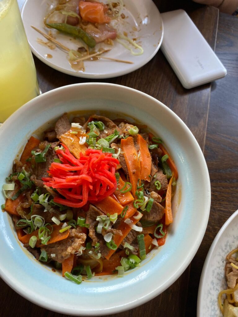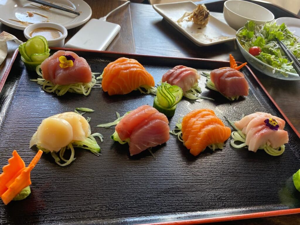 Posteriormente, se ofreció una de las preparaciones más representativas de la cocina nipona: el sashimi, presentado en un sampler con cortes frescos de atún, res y salmón. Este plato, que consiste en finas láminas de pescado y carne servidas sin arroz, se disfruta mejor acompañado de salsa de soya, un toque de wasabi o jengibre encurtido, resaltando la frescura y pureza de cada ingrediente.