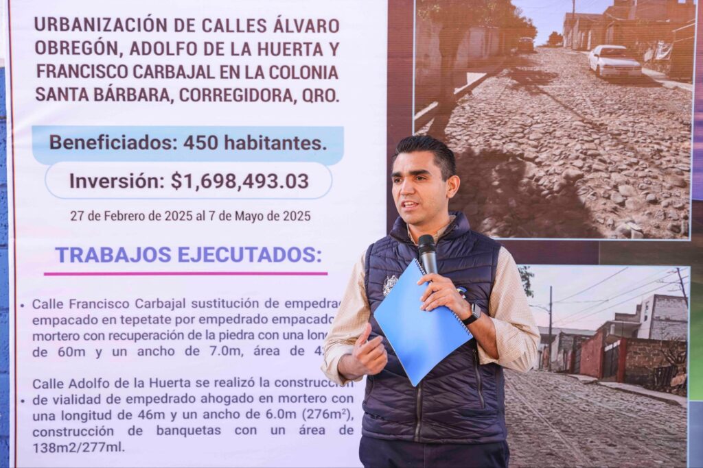 - El Jefe de Gabinete Municipal de Corregidora, Carlos Contreras, en representación del alcalde Chepe Guerrero, entregó la obra de urbanización de las calles Adolfo de la Huerta, Francisco Carbajal y Adolfo Ruiz Cortines en la colonia Santa Bárbara, la cual beneficia a más de 450 habitantes de la zona gracias a una inversión de 2.3 millones de pesos.