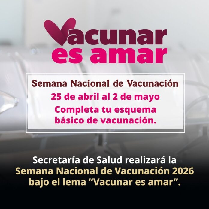La Secretaría de Salud del Estado de Querétaro informa que en el marco de la vigésima cuarta Semana de Vacunación en las Américas (SVA) y Semana Mundial de Inmunización 2026, se llevará a cabo en el país la Semana Nacional de Vacunación 2026, bajo el lema “Vacunar es amar”, del 25 de abril al 2 de mayo de 2026 como parte de las acciones prioritarias para la prevención, control y eliminación de enfermedades.