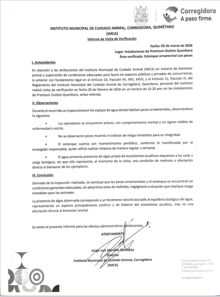 En respuesta, Premium Outlets Querétaro informó que el pasado 20 de febrero de 2026 el Instituto Municipal de Cuidado Animal (IMCA) de Corregidora realizó una inspección en el lugar. Según el comunicado, la autoridad determinó que los peces ornamentales y el estanque se encontraban en condiciones generales adecuadas, sin advertirse maltrato, negligencia o riesgo inmediato. Asimismo, señaló que la presencia de algas correspondía a un proceso natural del equilibrio biológico del agua .