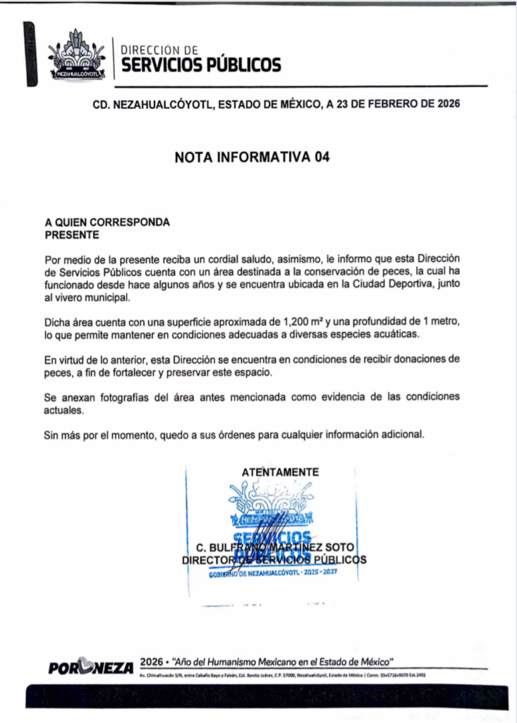 La Dirección de Servicios Públicos de Nezahualcóyotl confirmó estar en condiciones de recibir donaciones de peces para fortalecer dicho espacio .