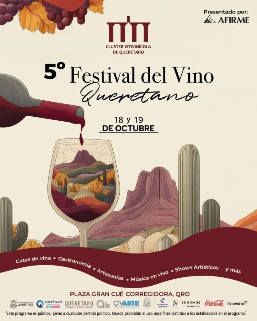 La Secretaría de Turismo del estado de Querétaro (SECTUR), en voz de la directora de Planeación y Desarrollo Turístico, María José Torres Cervantes, anunció la realización del 5º Festival del Vino Queretano, que se llevará a cabo del 17 al 19 de octubre de 2025 en el municipio de Corregidora como cierre de la temporada de vendimias en el estado.