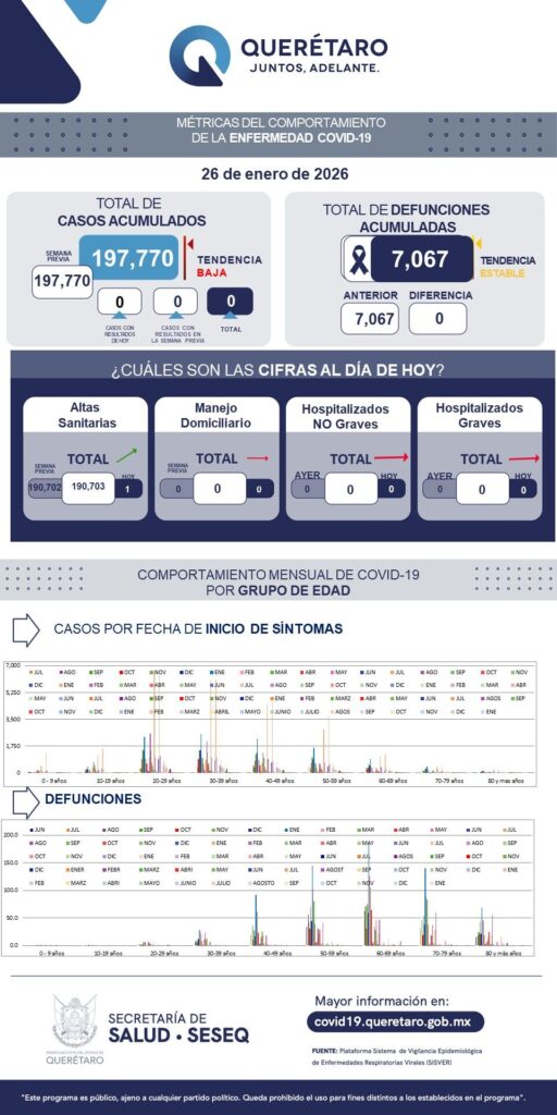 La Secretaría de Salud de Querétaro reportó este lunes cero defunciones por COVID-19, y que en los últimos siete días no se han sumado casos de la enfermedad en el estado. El registro acumulado es de 197 mil 770 casos: 54 por ciento son mujeres y 46 por ciento son hombres.