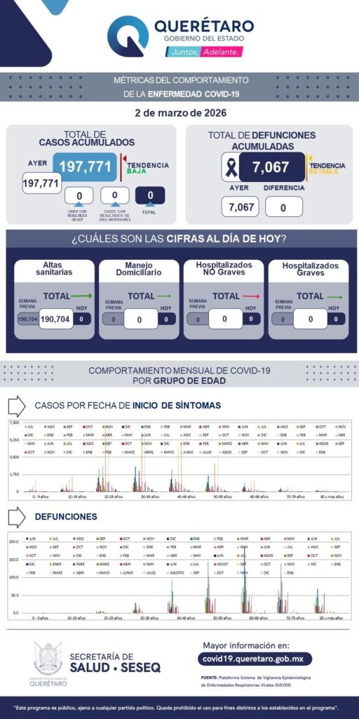 La Secretaría de Salud de Querétaro reportó este lunes cero defunciones por COVID-19, y que en los últimos siete días no se han sumado casosde la enfermedad en el estado. El registro acumulado es de 197 mil 771 casos: 54 por ciento son mujeres y 46 por ciento son hombres.