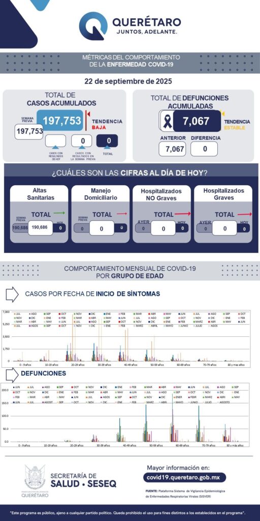 La Secretaría de Salud de Querétaro reportó este lunes cero defunciones por COVID-19 y que, en los últimos siete días no se han sumado casos de la enfermedad en el estado. El registro acumulado es de 197 mil 753 casos: 54 por ciento son mujeres y 46 por ciento son hombres.