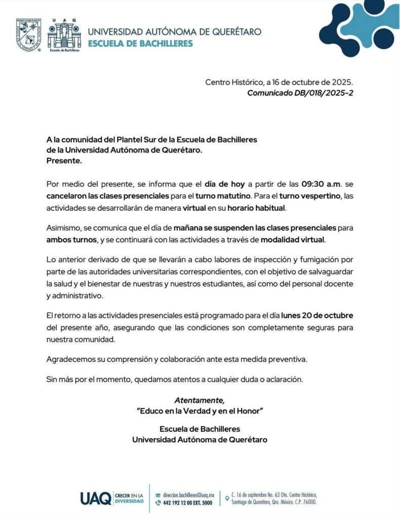 La UAQ reiteró su compromiso con la salud y seguridad de la comunidad estudiantil, asegurando que continuará aplicando protocolos de desinfección y monitoreo en todos sus planteles para prevenir nuevos brotes.